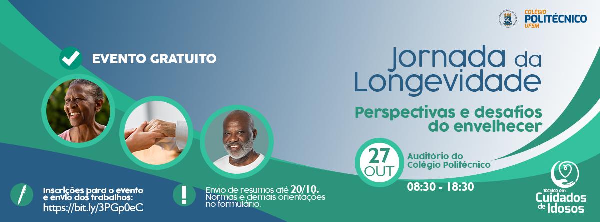 A Jornada da Longevidade da UFSM – Perspectivas e desafios do envelhecer, é um evento satélite da 38ª Jornada Acadêmica Integrada da Universidade Federal de Santa Maria e compõe a programação do Mês da Longevidade parceria do SESC, Prefeitura Municipal de Santa Maria e UFSM. A atividade tem como objetivo promover e aprofundar discussões de produções técnico-científicas acerca do envelhecimento e sua complexidade na contemporaneidade. Trata-se de um momento destinado a troca de experiências, com uma programação científica haverá apresentação de trabalhos selecionados que irão compor um eBook sobre a temática em discussão. É destinado a todas as pessoas que têm interesse na área do envelhecimento e da longevidade.