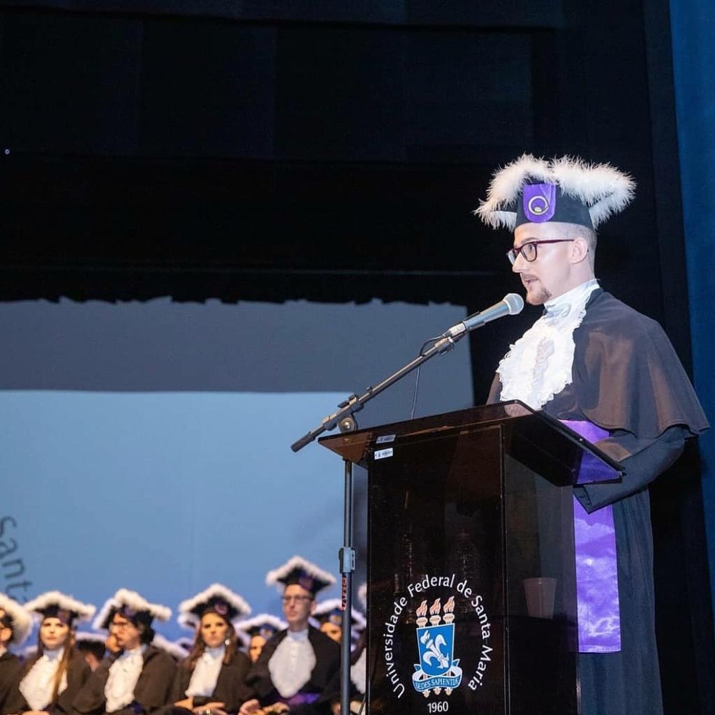 “A UFSM foi minha casa, literalmente, ao longo dos 8 anos que permaneci nela. Pude formar-me como Técnico em Meio Ambiente (2015) no Colégio Politécnico e Químico Licenciado (2019) no Centro de Ciências Naturais e Exatas. Sou muito grato pela oportunidade de estudar numa das melhores Universidades deste país e ter acesso à formação cidadã de excelência. A Universidade Federal de Santa Maria abriu um horizonte de possibilidades em minha vida. Minha lembrança compartilhada é a oportunidade de discursar como orador na maior formatura já realizada pelo Centro de Ciências Naturais e Exatas nestes 60 anos de história e poder defender a Universidade que permitiu que o filho pobre de uma costureira e um armador pudesse permanecer e concluir os estudos graças ao maior Programa de Assistência Estudantil da América Latina. Orgulho em SER UFSM!”