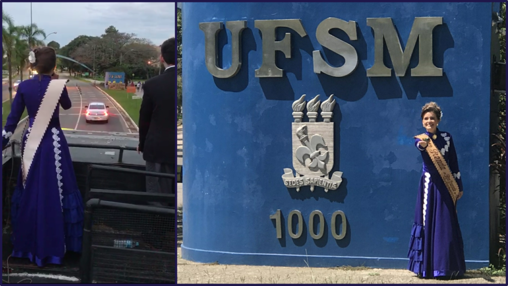 “Dentre diversos momentos marcantes e inesquecíveis, destaco 19 de maio de 2019, o dia que trouxe para a UFSM e para o DTG Noel Guarany o título de 1ª Prenda do Rio Grande do Sul. Adentrei o Arco da UFSM expondo a emoção de entregar essa conquista à instituição e a todos que acreditam e defendem a Cultura e a Educação. Para além de sonho, foi a realização de um objetivo construído por muitas mãos nesse Departamento de Tradições Gaúchas, para que a nossa voz ecoasse em todos os pagos, que nossas ações multiplicassem ideias e feitos. Tantos significados cruzaram o Arco comigo que parece impossível descrever… mas cada vez que minha memória remonta aquele momento, meus olhos revivem as lágrimas de emoção, meu peito reitera a gratidão, e minha alma renova a missão! Obrigada UFSM, por ser a minha casa de tantas causas!”