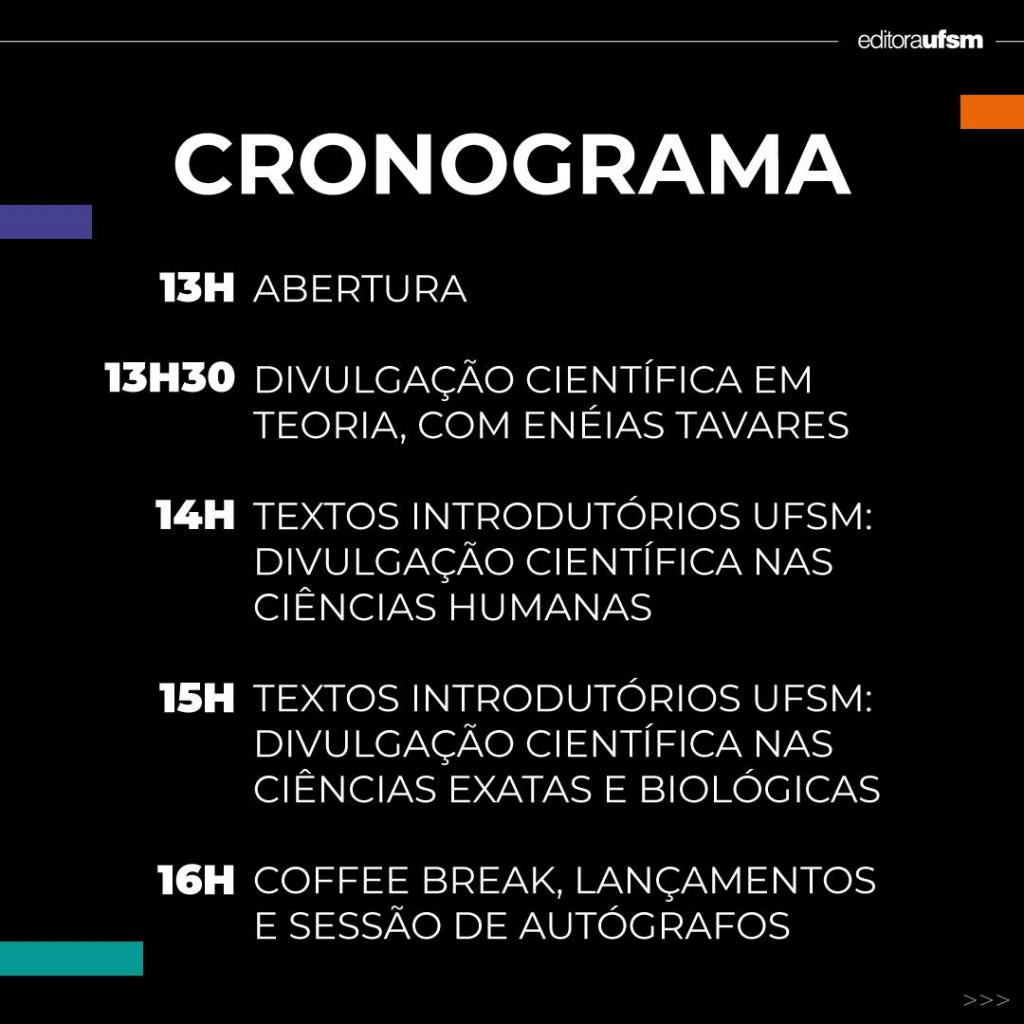 O evento é destinado a alunos, docentes e leitores da comunidade acadêmica e contará com a presença dos autores da Coleção Textos Introdutórios UFSM. Ao final dos debates, eles participarão de uma sessão de autógrafos. Aos inscritos, será disponibilizado certificado de participação de 3 horas, que poderá servir como atividade complementar de graduação. As inscrições para o evento estão abertas e podem ser realizadas por meio do link disponibilizado nos perfis oficiais da Editora UFSM. Nas redes sociais (@editoraufsm), podem ser encontradas informações adicionais, como o cronograma do evento e uma relação mais detalhada de todos títulos que serão lançados.