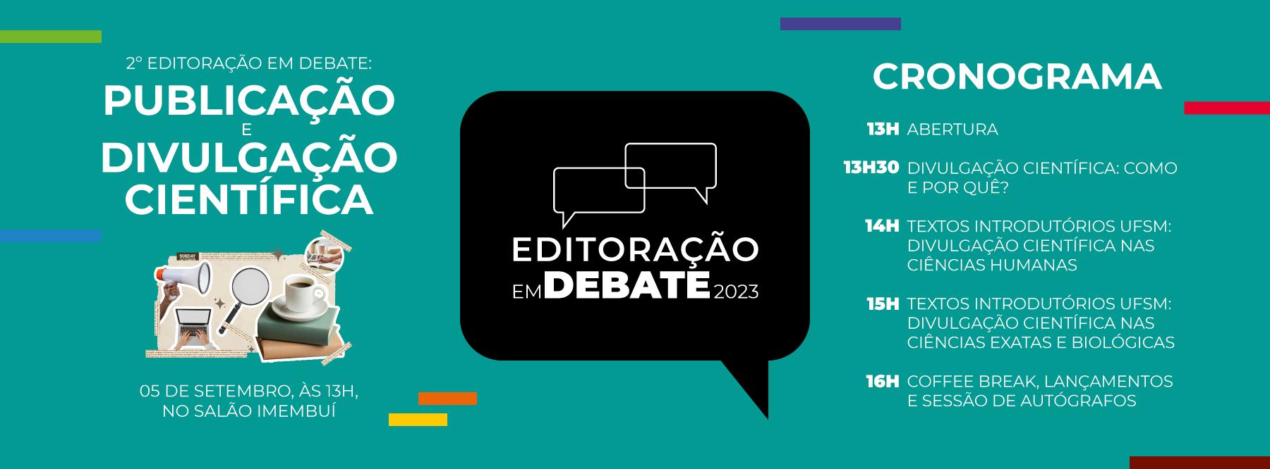 No próximo dia 05, acontecerá a edição de 2023 do evento Editoração em Debate, às 13h, no Salão Imembuí (2º andar da Reitoria). Promovido pela Editora UFSM, o encontro objetiva discutir temas atuais sobre editoração, além de evidenciar o que vem sendo produzido pela editora da Universidade. Neste ano, o Editoração em Debate destacará a publicação e a divulgação científica, abordando questões pertinentes à ciência e aos construtos acadêmicos no cenário editorial, que representam o foco principal do trabalho desenvolvido pelo setor. As discussões serão mediadas pelo diretor da Editora UFSM, o professor Enéias Tavares.