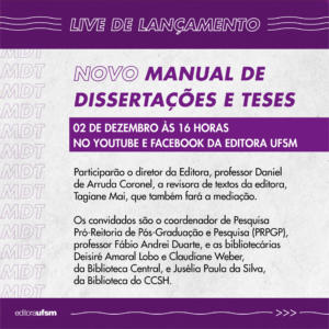 No dia 2 de dezembro, às 16h, o perfil no Facebook e o canal no YouTube da Editora, vão transmitir o lançamento da MDT. Durante a live de lançamento, participarão o diretor da Editora, professor Daniel de Arruda Coronel, a revisora de textos da editora, Tagiane Mai, que também fará a mediação. Os convidados são o coordenador de Pesquisa Pró-Reitoria de Pós-Graduação e Pesquisa (PRPGP), professor Fábio Andrei Duarte, e as bibliotecárias Deisiré Amaral Lobo e Claudiane Weber, da Biblioteca Central, e Jusélia Paula da Silva, da Biblioteca do Centro de Ciências Sociais e Humanas (CCSH).