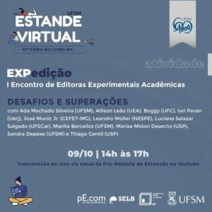 EXPEDIÇÃO – I Encontro de Editoras Acadêmicas Experimentais, é uma iniciativa da pE.com, editora experimental do curso de Produção Editorial da UFSM, em parceria com o Laboratório de Publicações Lima Barreto – SELB (UERJ) e o Arquivo dos Livros (UFF). No encontro, doze representantes de laboratórios e editoras experimentais dos mais diversos estados brasileiros comentam os desafios e superações na jornada de edição de livros.