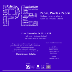 O Clube dos Editores do Rio Grande do Sul e o curso de Comunicação Social de Produção Editorial da Universidade Federal de Santa Maria (UFSM) realizam, neste domingo (15), durante a 61ª Feira do Livro de Porto Alegre, o evento Papo, Pixels e Papéis – Roda de conversa sobre o Mercado Editorial a partir do olhar dos jovens. Debatendo o que os jovens estão aprendendo para entrar em ação no futuro editorial brasileiro,  o que se esperar dessa nova geração e se os recursos tradicionais dão conta do que desejam estes jovens profissionais.