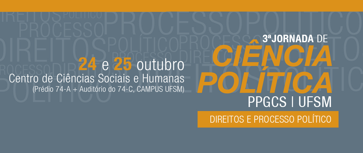 A III Jornada de Ciência Política da Universidade Federal de Santa Maria, com o tema DIREITOS E O PROCESSO POLÍTICO, organizada pelo Núcleo de Pesquisa e Estudos em Ciência Política (NPCP) e pelo Núcleo de Estudos sobre Democracia e Desigualdades (NEDD), nos dias 24 e 25 de outubro de 2018, integrada à programação da Jornada Acadêmica Integrada (JAI), visa reunir a comunidade acadêmica da própria UFSM e de outras instituições para debater e analisar direitos e processo político a partir da Constituição de 1988, que este ano completa 30 anos, observando a capacidade de atuação dos atores políticos e sociais nos diversos processos, suas dinâmicas e consequências. Assim, o evento busca se inserir no processo de formação e de estímulo da produção acadêmica em Ciência Política.