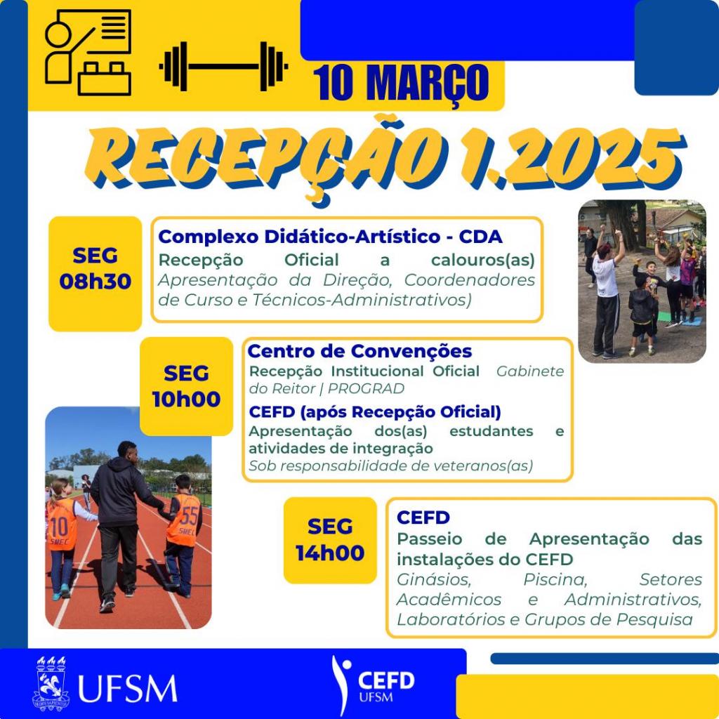 Já às 10h, a recepção segue para o Centro de Convenções da UFSM, onde o Reitor dará as boas-vindas aos estudantes. Além dessas atividades, outras programações de recepção estão sendo organizadas, incluindo iniciativas da Prefeitura municipal, na Gare.