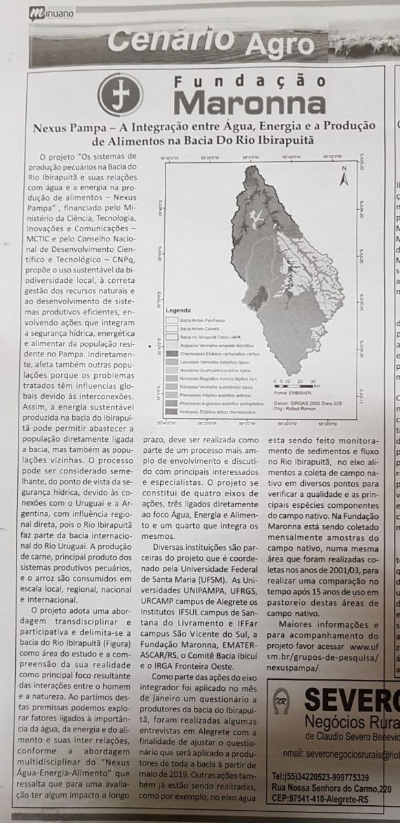Na edição do dia 09 de março de 2019, o Jornal Expresso Minuano, de Alegrete/RS, foi publicada uma reportagem sobre o Projeto Nexus Pampa, abordando a integração entre água, energia e a produção de alimentos na Bacia do Rio Ibirapuitã.