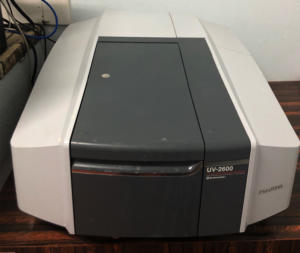 Espectrofotômetro UV-Vis Shimadzu UV-2600 com janela espectral de 185-900 nm para operação em cubetas de quartzo (em solução). Pode operar com esfera integradora para medidas de refletância difusa relativa (para amostras sólidas) Shimadzu ISR-2600 com janela espectral de 220-800 nm usando BaSO4 como material de referência.