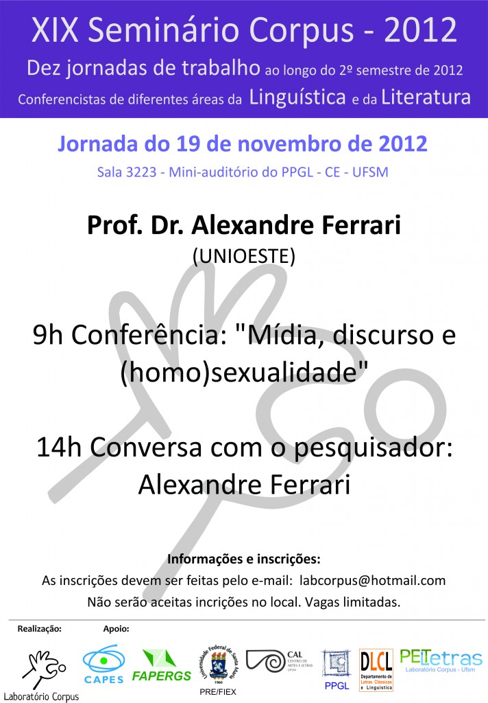 O CORPUS, Laboratório de Estudos de Fontes da Linguagem, dá continuidade à série de Dez Jornadas de Trabalho ao longo do segundo semestre de 2012, com a participação de diferentes conferencistas da Linguística e da Literatura. Na programação do evento da próxima segunda-feira (19/Nov), haverá, às 9h, conferência com o prof. Dr. Alexandre Ferrari (Unioeste/PR), sob o tema “Mídia, discurso e (homo)sexualidade”; à tarde, com a presença do ilustre convidado, acontece Conversas com o pesquisador, junto aos professores, acadêmicos e pesquisadores do PPGL, Corpus e PET Letras.