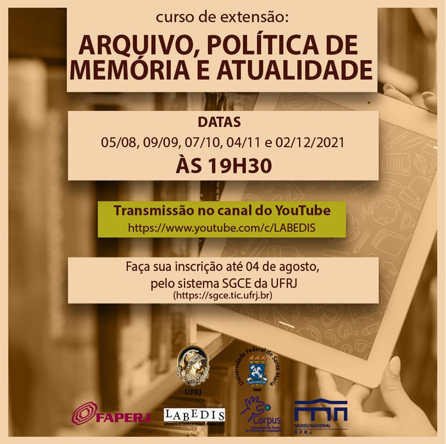 O LABEDIS – Laboratório de Estudos do Discurso, Imagem e Som, do Museu Nacional da UFRJ, juntamente ao Laboratório Corpus da UFSM, organiza e divulga o curso de extensão “Arquivo, política de memória e atualidade”. A proposta do curso é constituir um espaço de relações de conhecimento e de trocas de experiências entre pesquisadores que trabalham com arquivo e políticas de memória nas ciências da linguagem e áreas afins.