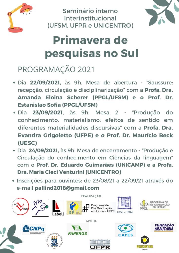 O Seminário Interinstitucional promovido pela Universidade Federal de Santa Maria (UFSM), Universidade Estadual do Centro-Oeste (UNICENTRO) e Universidade Federal do Paraná (UFPR), em sua segunda edição, “Primavera de pesquisas no Sul: epistemologia e produção do conhecimento em ciências da linguagem”, acontecerá nos dias 22, 23 e 24 de setembro.