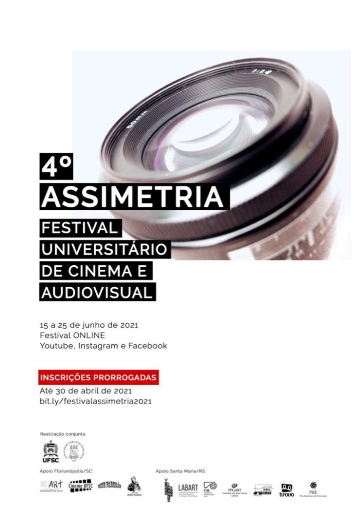 Diante disso, a 4ª edição do Assimetria será realizada, exclusivamente, em meio online, com a exibição pública no canal do Festival Assimetria no Youtube entre os dias 15 e 25 de junho de 2021. As inscrições das produções podem ser feitas on-line até o dia 25 de abril (às 23h59min) de 2021. São aceitas produções da Região Sul do Brasil (RS, SC e PR) e da Argentina, Uruguai, Paraguai e Chile. O edital pode ser acessado em http://bit.ly/festivalassimetria2021.