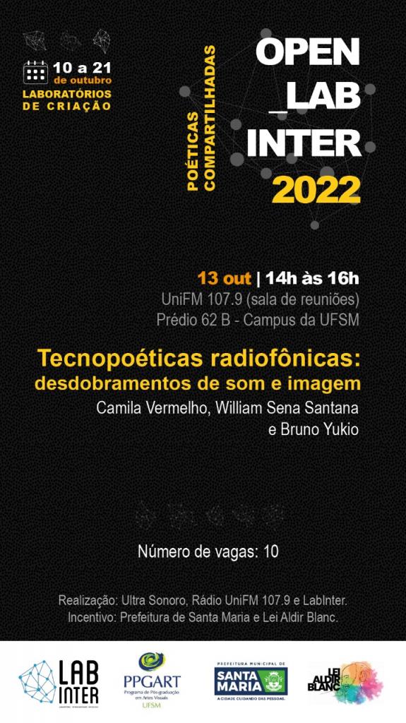 O LabInter está com ampla programação para este mês de outubro, de forma gratuita e com certificado. Com os Laboratórios de Criação, ou OpenLab 2022 – OpenLabInter, de 10 a 21 de outubro, na Sala de Exposições Cláudio Carriconde – CAL UFSM e na rádio UniFM 107.9, espaços localizados no Campus Camobi da UFSM.