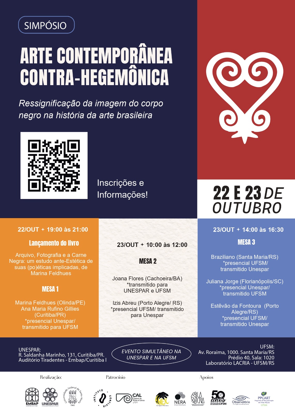 Nos dias 22 e 23 de outubro, acontece o Simpósio Arte Contemporânea Contra-Hegemônica: Ressignificação da imagem do corpo negro na história da arte brasileira, evento realizado simultaneamente pela UNESPAR e pela UFSM.