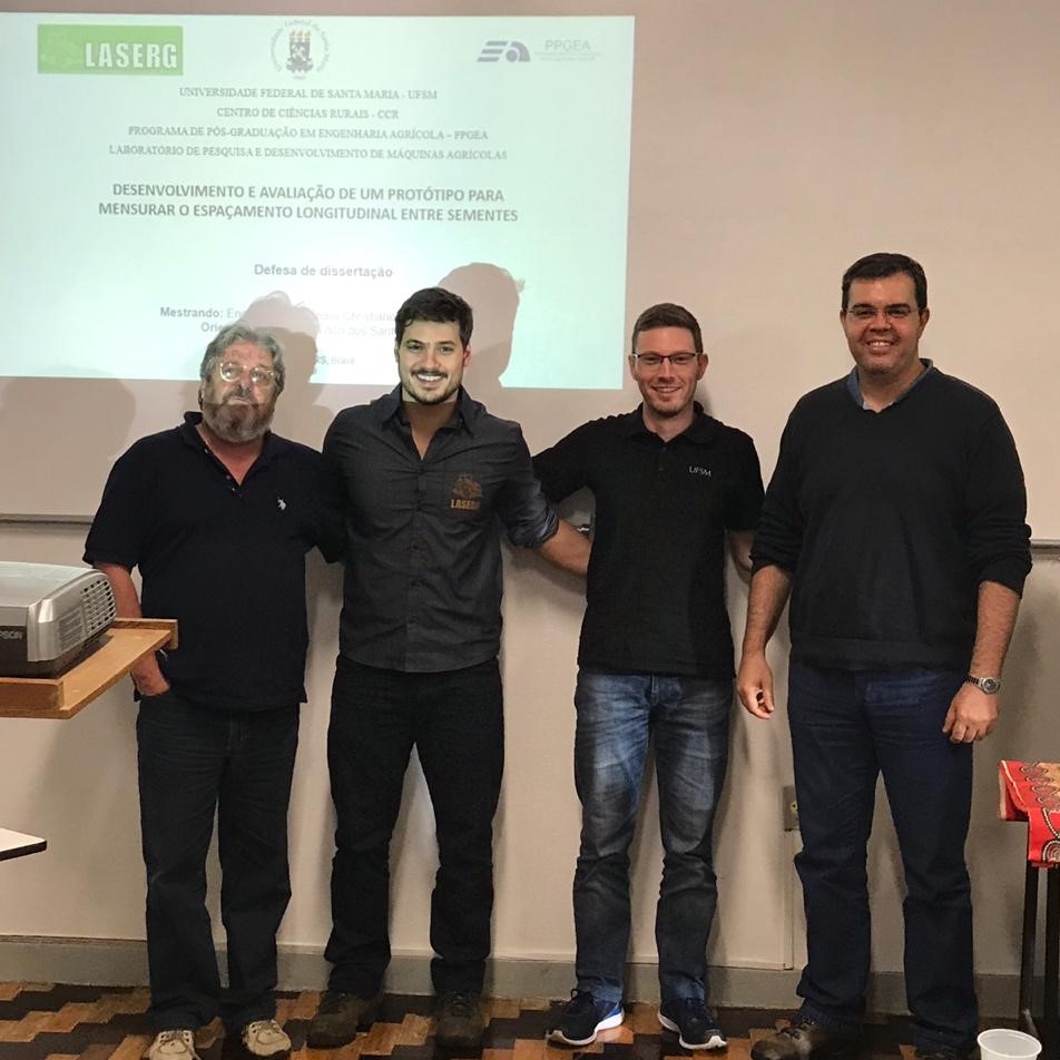 No dia 29 de Abril de 2019 o Engenheiro Mecânico Bruno Christiano Correa Ruiz Zart, discente do Programa de Pós-Graduação em Engenharia Agrícola da Universidade Federal de Santa Maria - UFSM, realizou a defesa de mestrado (Desenvolvimento e avaliação de um protótipo para mensurar o espaçamento longitudinal entre sementes). A defesa foi realizada no Laboratório de Pesquisa e Desenvolvimento de Máquinas Agrícolas - LASERG/UFSM.