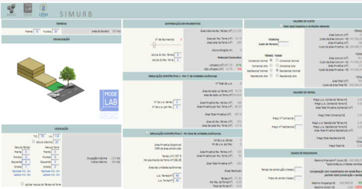 Nessa pesquisa estamos desenvolvendo uma ferramenta para realização de simulações de viabilidade legal e econômica para implantação de edificações urbanas, além de simular e ilustrar em tempo real os dados exportados para o aplicativo, mostrando para o usuário a volumetria ideal possível de ser construída de acordo com as informações atribuídas. A abordagem adotada para o desenvolvimento da ferramenta foi reunir conhecimentos em design da informação e em especificidades relativas à construção de edificações, tais como planos diretores, leis específicas de uso do solo, custos de construção e preços de venda. Dessa maneira foi possível desenvolver um aplicativo de simulação onde usuários podem interagir e obter resultados rápidos, permitindo tomadas de decisão com mais segurança e possibilitando gerar simulações para fins de comparação.