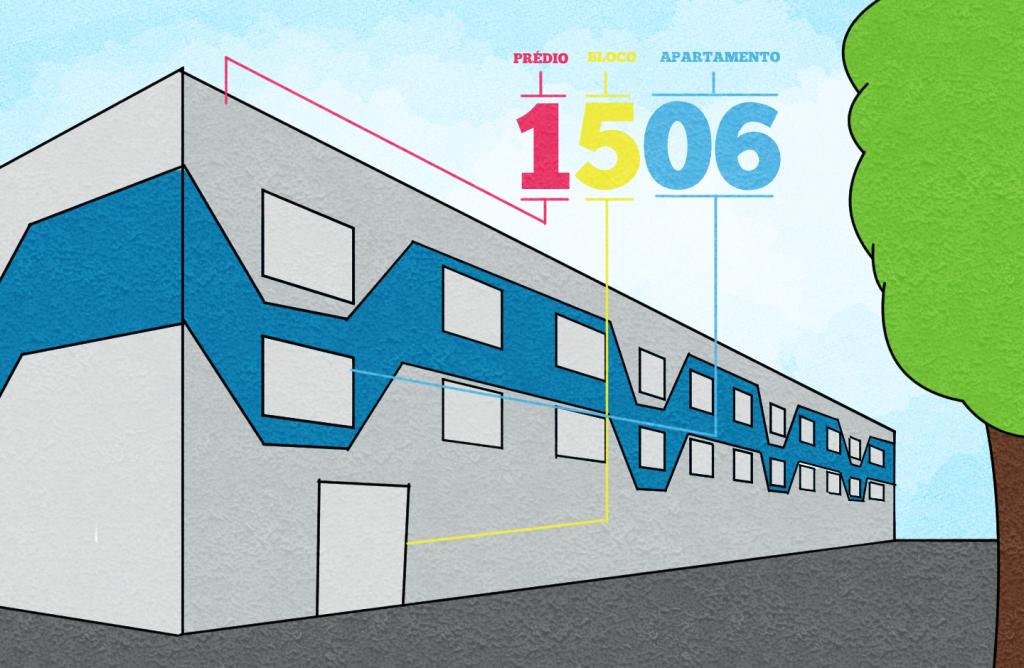 6. As moradias da Casa do Estudante foram numeradas de acordo com outro critério: cada prédio é representado por um milhar. Por exemplo, o primeiro deles, ao lado do RU I é o prédio 1000; cada bloco é distinguido por uma centena e cada apartamento por uma dezena.