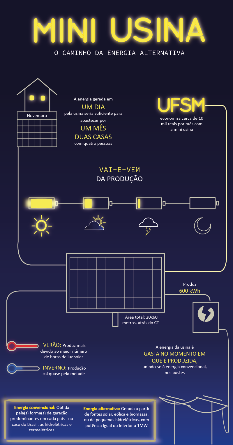 Iluminar os quase cem prédios da UFSM, além de fazer funcionar equipamentos de laboratórios e outros setores, gera um gasto mensal de aproximadamente um milhão de reais com energia elétrica. Como alternativa a parte dessa conta, a Universidade inaugurou na última terça-feira (06) uma mini usina fotovoltaica, instalada aos fundos do Centro de Tecnologia. O local foi escolhido por ter menor sombreamento, além de estar próximo aos responsáveis pelo controle das placas.