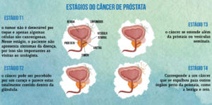 Estágio T1: o tumor não é detectável por toque e apenas algumas células são cancerígenas. Nesse estágio, o paciente não apresenta sintomas da doença, por isso são importantes as visitas ao urologista.