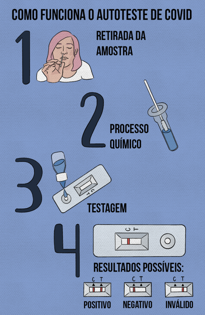 O autoteste de Covid-19 é uma testagem de antígeno, isso significa que ele detecta proteínas produzidas pelo Sars-CoV-2, e é similar ao chamado teste rápido, feito em farmácias. O kit do autoteste costuma conter um swab nasal estéril, que serve para coleta do material, o tampão de extração, a tampa do filtro, o dispositivo de teste e o reagente – líquido que apresenta resultado positivo ou negativo a partir do contato com o material genético do vírus.