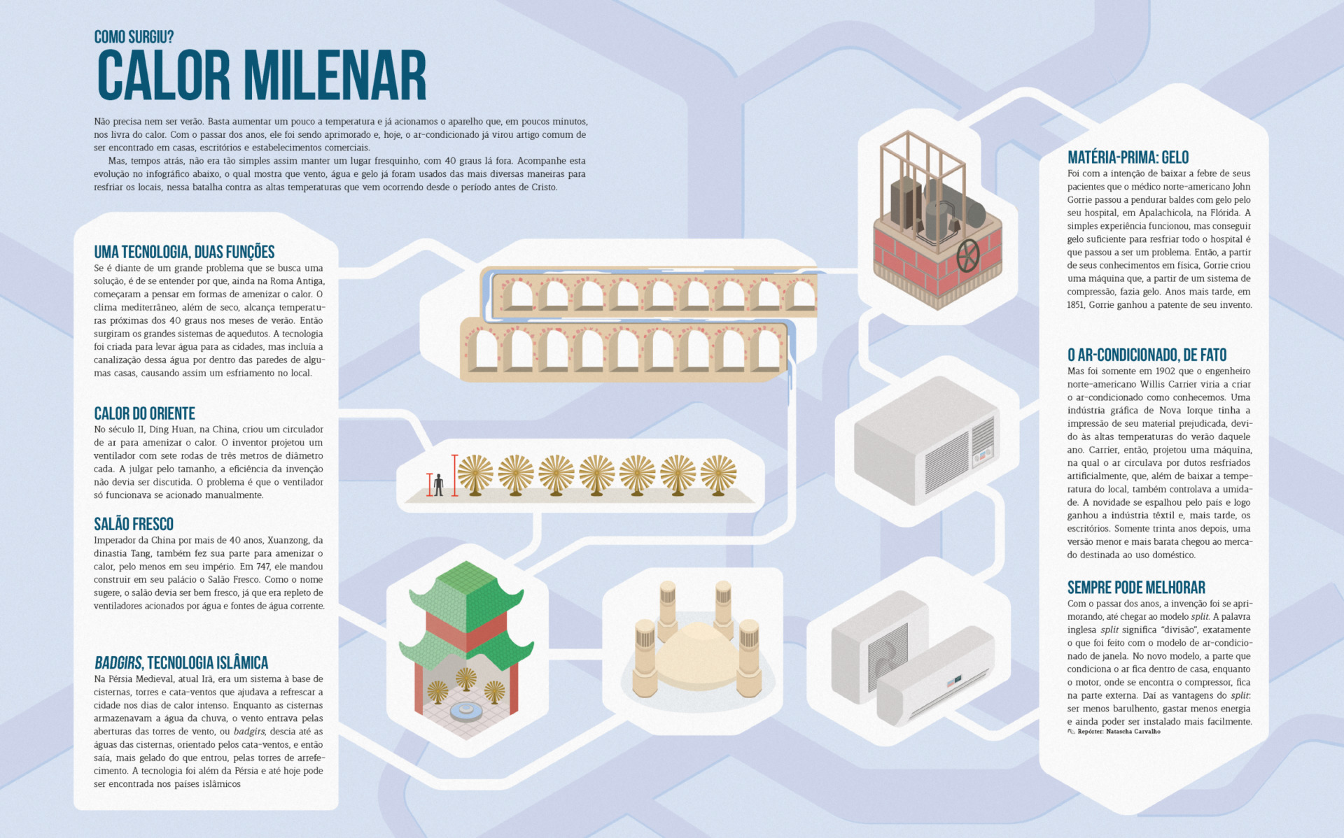 Não precisa nem ser verão. Basta aumentar um pouco a temperatura e já acionamos o aparelho que, em poucos minutos, nos livra do calor. Com o passar dos anos, ele foi sendo aprimorado e, hoje, o ar-condicionado já virou artigo comum de ser encontrado em casas, escritórios e estabelecimentos comerciais. Mas, tempos atrás, não era tão simples assim manter um lugar fresquinho, com 40 graus lá fora. Acompanhe esta evolução no infográfico abaixo, o qual mostra que vento, água e gelo já foram usados das mais diversas maneiras para resfriar os locais, nessa batalha contra as altas temperaturas que vem ocorrendo desde o período antes de Cristo.