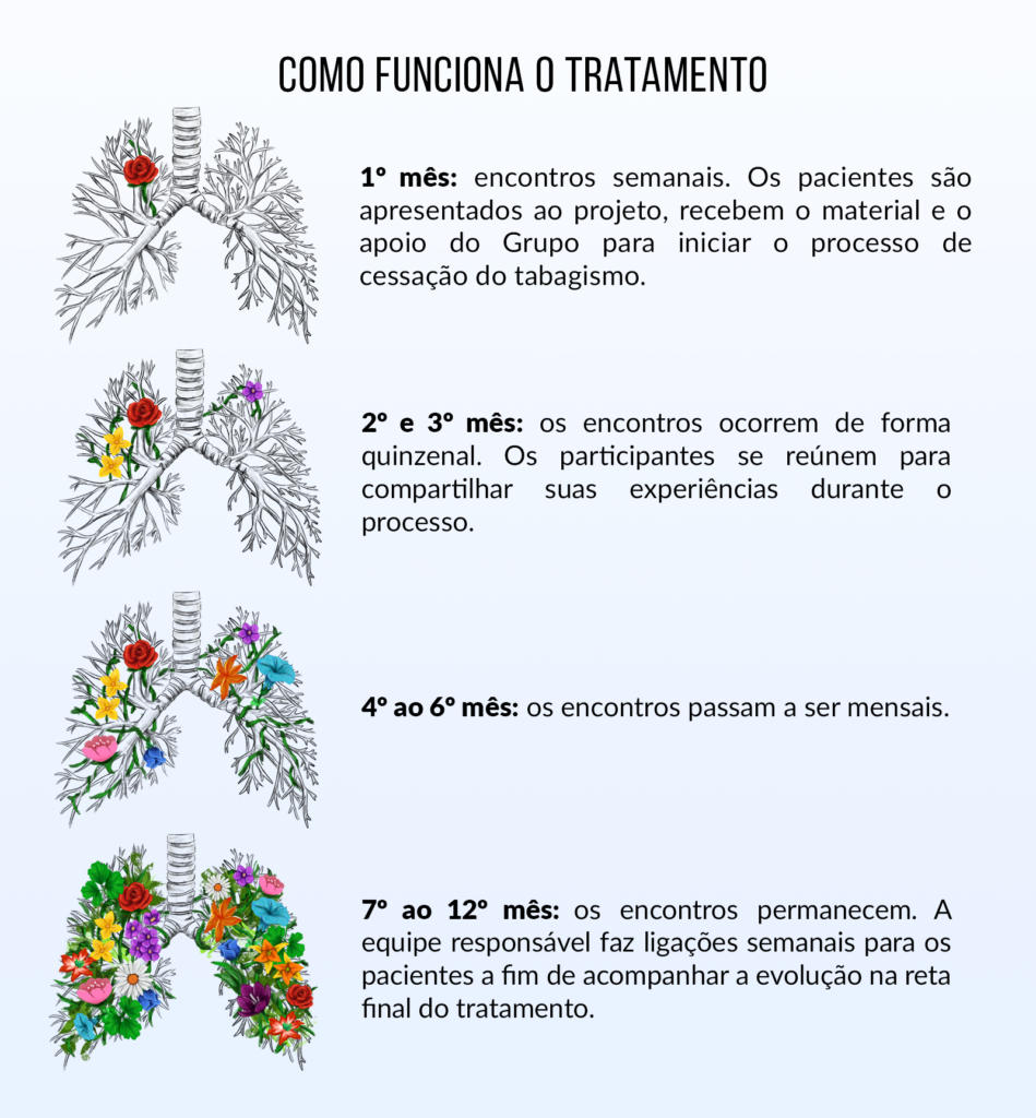 O tratamento tem duração de um ano e é dividido em duas etapas: os três primeiros meses exigem encontros presenciais do grupo; já os nove meses restantes são de acompanhamento por parte da equipe de profissionais. Teodora Alves, enfermeira do Serviço de Pneumologia do Husm e uma das coordenadoras do GCCT, explica que “uma parte do tratamento é medicamentoso e a outra parte é a terapia cognitiva comportamental. As medicações utilizadas no tratamento são a bupropiona, adesivos e gomas de mascar com nicotina. Elas são indicadas nos primeiros três meses”.