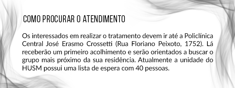 No município, há seis Grupos de Controle e Cessação de Tabagismo, um deles com as atividades desenvolvidas pelo Serviço de Pneumologia do Hospital Universitário de Santa Maria (Husm). O Grupo do Husm teve início em 2015, com a capacitação dos profissionais para a atuação. Na época, participaram das ações um médico do corpo clínico, dois residentes e duas enfermeiras. A aplicação do projeto piloto teve início em julho de 2016.