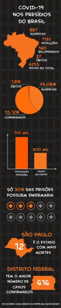 No painel disponível no site do Depen, a estatística aponta que foram realizados 4.255 testes nos presídios do país e, com isso, foram diagnosticados 1135 presos com covid-19, 887 suspeitas e 37 óbitos. O estado de São Paulo é o que tem o maior número de mortos, são 12. Já o Distrito Federal configura o maior número de casos confirmados, somando 616 contaminados. O Rio Grande do Sul confirmou um caso no Presídio Regional de Bagé.