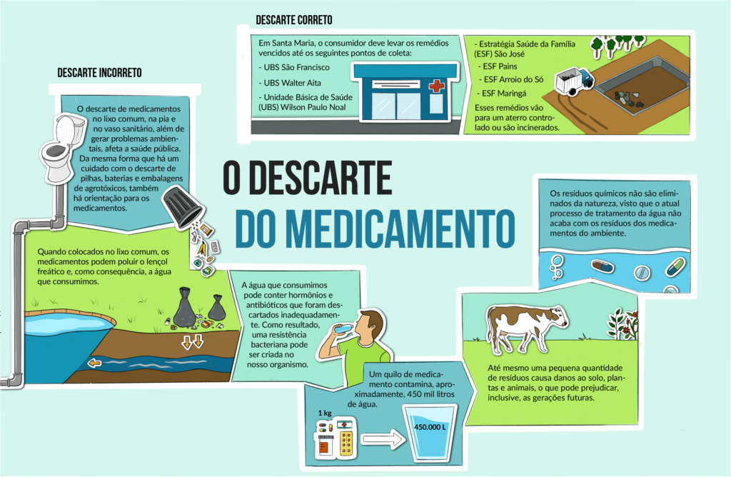 Resíduos de serviço de saúde são sobras das atividades de hospitais e clínicas. Medicamentos vencidos ou em desuso fazem parte desse grupo e necessitam de descarte correto, pois impactam o meio ambiente e a sociedade. Pensando nisso, o um programa de extensão da UFSM busca orientar a população sobre o descarte de medicamentos não utilizados, e disponibilizar mais locais para esse fim – além das farmácias, que são obrigadas, por legislação municipal, a aceitarem esse tipo de material.