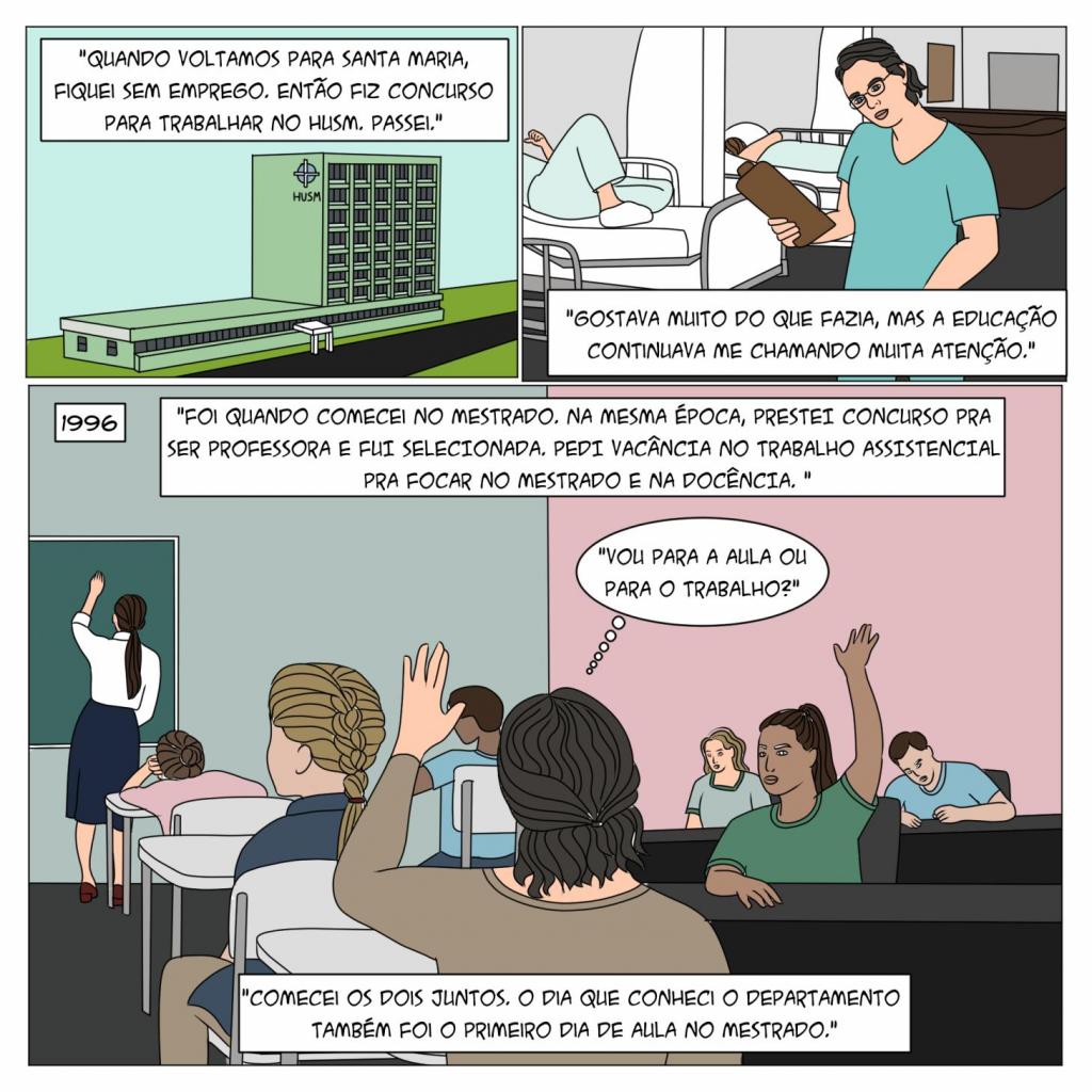 Quadrinho de HQ ilustrada quadrado e colorido, dividido em três partes. Na primeira, no lado superior esquerdo, Ilustração do Husm, prédio verde claro e longo, cuja parte direita é mais alta e tem sete andares. O texto: "Quando voltamos para Santa Maria, fiquei sem emprego. Então fiz concurso para trabalhar no Husm. Passei". Ao lado, ilustração de uma mulher de pele branca, cabelos escuros, curtos e lisos, usa óculos e veste camiseta verde marinho; segura uma prancheta nas mãos; aí fundo, pessoas deitadas em camas hospitalares. O texto: "Gostava muito do que fazia, mas a educação continuava me chamando muita atenção". Abaixo, o terceiro quadrado, com uma ilustração de sala de aula, dos fundos. Há uma professora escrevendo no quadro e duas alunas com a mão levantada. O ano indicado é 1996. O texto: "Foi quando comecei no mestrado. Na mesma época, prestei concurso pra ser professora e fui selecionada. Pedi vacância no trabalho assistencial pra focar no mestrado e na docência". Um balão de pensamento está ao lado de uma das alunas com a mão levantada, de pele branca e cabelos escuros, lisos e curtos. O texto no balão diz "Vou para a aula ou para o trabalho?". Abaixo, na parte inferior, o texto: "Comecei os dois juntos. O dia que conhecia o departamento também foi o primeiro dia de aula no mestrado".