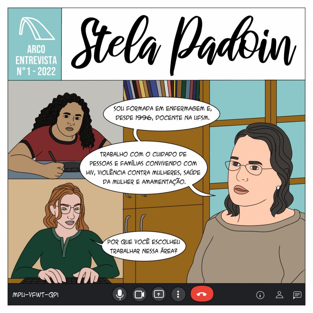 Quadrinho de HQ ilustrada quadrado e colorido. Na parte superior, em preto e letra cursiva, o título "Stela Padoin", ao lado da logomarca da Revista Arco, e da palavra "Entrevista 01/2022", em branco e sobre fundo azul claro. Abaixo, uma tela do meet com três mulheres. Na primeira tela, uma mulher negra, de cabelos cacheados e pretos, olhos grandes e escuros, boca e nariz grandes, veste uma camiseta vermelha e segura uma caneta preta em frente a uma mesa de desenho. Abaixo, uma mulher de pele branca, rosto angular, cabelos ruivos e levemente ondulados, olhos verdes; usa óculos e veste uma blusa de manga comprida na cor verde escuro; está em frente ao teclado do notebook. No lado direito, em tela maior, mulher de pele branca, cabelos escuros, lisos e na altura do pescoço; tem olhos escuros e sobrancelha pequena, nariz e boca pequena; veste blusa cinza e usa brinco circular branco. Ao fundo, uma janela e estante de livros. Do lado da mulher, há dois balões de fala, com as frases, em preto: "Sou formada em Enfermagem e, desde 1996, docente na UFSM"; e "Trabalho com o cuidado de pessoas e famílias convivendo com HIV, violência contra mulheres, saúde da mulher e amamentação". Abaixo, um balão de fala ao lado da mulher ruiva, com a frase "Por que você escolheu trabalhar nessa área?". Abaixo, uma aba prta com símbolo de microfone, câmera, compartilhamento de tela, configurações e desligar.