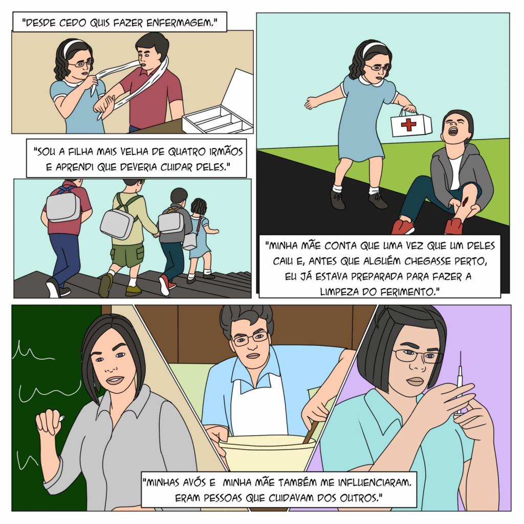 Quadrinho de HQ ilustrado e colorido, dividido em quatro quadrinhos. Na parte superior da imagem, o texto "Desde cedo quis fazer enfermagem". Abaixo, o primeiro quadrinho, em que uma menina de cabelo escuro e vestido azul claro faz uma tipoia em um menino de cabelo escuro e blusa bordô. Abaixo, o texto "Sou a filha mais velha de quatro irmãos e aprendi que deveria cuidar deles". Abaixo, o segundo quadrinho, com ilustração de quatro crianças, de costas, com uma mochila e descendo escadas. Ao lado, o terceiro quadrinho, em que a menina de vestido azul está com uma maleta de primeiros socorros na mão e ao lado de um menino sentado, que chora e tem um corte na perna. Abaixo, o texto "Minha mãe conta que uma vez um deles caiu e, antes que alguém chegasse perto, eu já estava preparada para fazer a limpeza do ferimento". Abaixo, no último quadro, está dividido em três partes: na primeira, mulher de pele branca e cabelos escuros, curtos e lisos está em frente a um quadro e segura um giz branco na mão. Na segunda, uma mulher mais velha, de pele branca e cabelo curto, usa avental branco sobre blusa azul e mexe uma colher de pau em uma bacia; e a terceira, de pele branca, cabelos escuros, lisos e curtos, ua óculos, veste blusa verde marinho e segura uma seringa nas mãos. Abaixo, o texto "Minhas avós e minha mãe também me influenciaram, eram pessoas que cuidavam dos outros"