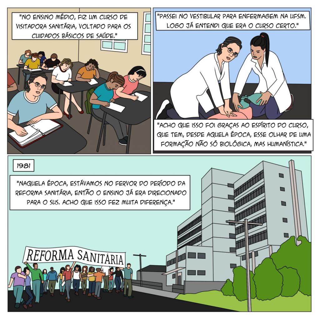 Quadrinho de HQ ilustrada quadrado e colorido, dividido em três partes. A primeira, na parte superior esquerda, tem ilustração de uma sala de aula com carteiras duplas e nove pessoas. Acima, o texto "No ensino médio, fiz um curso de visitadora sanitária, voltado para os cuidados básicos de saúde". No lado, no segundo quadrinho, Ilustração de duas mulheres de jaleco branco fazendo exercício de respiração manual. Os textos estão acima e abaixo do desenho: "Passei no vestibular para enfermagem na UFSM. Logo já entendi que era o curso certo", e "Acho que isso foi graças ao espírito do curso, que tem, desde aquela época, esse olhar de uma formação não só biológica, mas humanística". Abaixo, o terceiro quadrinho, de pessoas em marcha, com uma faixa com o texto "Reforma Sanitária". As pessoas caminham em estrada asfaltada ao lado de um prédio cinza. O ano indicado é 1981. Abaixo, o texto: "Naquela época, estávamos no fervor do período da reforma sanitária, então o ensino já era direcionado para o SUS. Acho que isso fez muita diferença".