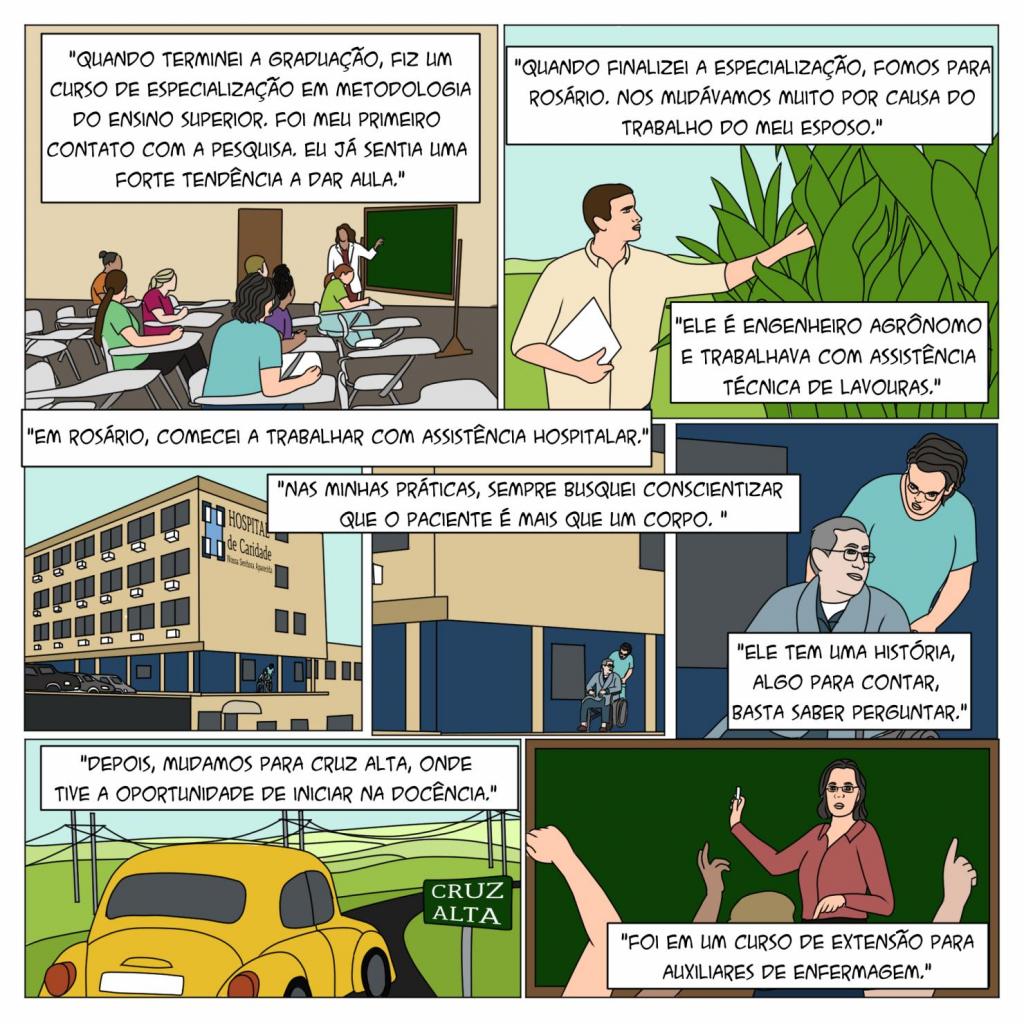 Quadrinho de HQ ilustrada quadrado e colorido, dividido em sete partes. Na superior esquerda, ilustração de uma sala de aula, com o texto "Quando terminei a graduação, fiz um curso de especialização em metodologia do ensino superior. Foi meu primeiro contato com a pesquisa. Eu já sentia uma forte tendência a dar aula". Ao lado, Ilustração de um homem de pele branca e cabelos marrons, ao lado de uma folhagem alta. Os textos: "Quando finalizei a especialização, fomos para Rosário. Nos mudávamos muito por causa do trabalho do meu esposo"; e "Ele é engenheiro agrônomo e trabalhava com assistência técnica de lavouras". O terceiro quadrinho, na metade esquerda do card, tem a ilustração de um prédio de quatro andares na cor bege, e com o nome "Hospital de Caridade". Ao lado, detalhe dos pilares do hospital, local em que está uma mulher de roupa verde claro empurrando um homem em cadeiras de rodas. Os textos: "Em Rosário, comecei a trabalhar com assistência hospitalar"; e "Nas minhas práticas, sempre busquei conscientizar que o paciente é mais que um corpo". Ao lado, quadrinho cinco, com ilustração em zoom da enfermeira que empurra a cadeira de rodas do homem. O texto: "Ele tem uma história, algo para contar, basta saber perguntar". Na terceira linha, o quadrinho seis está do lado esquerdo e tem a ilustração de um Fusca em uma estrada, com campos verdes dos dois lados e uma placa verde com a palavra "Cruz Alta". O texto: "Depois, nos mudamos para Cruz Alta, onde tive a oportunidade de iniciar na docência". Ao lado, ilustração de uma mulher de pele branca, cabelos curtos, lisos e escuros, que usa óculos de grau e veste camisa rosa queimado, está em frente a um quadro verde. Pessoas levantam a mão. O texto: "Foi em um curso de extensão para auxiliares de enfermagem".