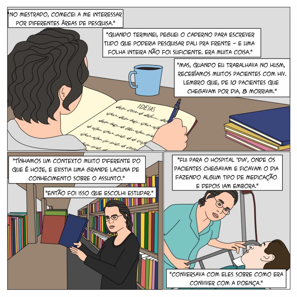 Quadrinho de HQ ilustrada quadrado e colorido, dividido em três partes. A primeira, na parte superior, tem ilustração de uma pessoa estudando. Há uma mesa marrom, com uma xícara de café, três livros e um papel com a palavra "Ideias" e anotações. Os textos: "No mestrado, comecei a me interessar por diferentes áreas de pesquisa"; "Quando terminei, peguei o caderno para escrever tudo que poderia pesquisar dali pra frente - e uma folha inteira não foi suficiente. Era muita coisa"; e "Mas, quando eu trabalhava no Husm, recebíamos muitos pacientes com HIV. Lembro que, de 10 pacientes que chegavam por dia, 8 morriam". Abaixo, o segundo quadrinho, na esquerda inferior, com a ilustração de uma mulher em um corredor de biblioteca. Ela segura um livro azul nas mãos. Os textos: "Tínhamos um contexto muito diferente do que é hoje, e existia uma grande lacuna de conhecimento sobre o assunto"; e "Então foi isso que escolhi estudar". Ao lado, o terceiro quadrinho, com Ilustração da mulher só lado de uma maca de hospital, olhando para um homem deitado, que tem a pele branca e cabelo castanho escuro. Os textos: "Fui para o hospital 'Dia', onde os pacientes chegavam e ficavam o dia fazendo algum tipo de medicação e depois iam embora"; e "Conversava com eles sobre como era conviver com a doença".