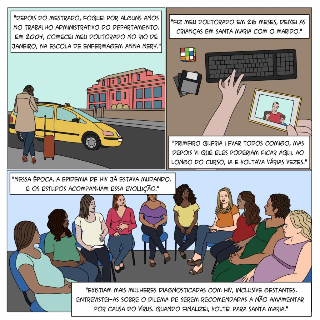 Quadrinho de HQ ilustrada quadrado e colorido, dividido em três partes. A primeira, na parte superior esquerda, tem ilustração de uma mulher, de costas, ao lado de uma mala. Ela veste casaco bege, calça jeans e calçados vermelhos. Está em frente a um táxi amarelo. Ao fundo, um prédio alto e vermelho. O texto: "Depois do mestrado, fiquei por alguns anos no trabalho administrativo do departamento. Em 2004, comecei meu doutorado do Rio de Janeiro, na Escola de Enfermagem Anna Nery". Ao lado, ilustração de cima de uma mesa, com um teclado preto, três cartões de memória, um cubo mágico colorido e uma foto de um homem com duas crianças, um menino e uma menina. Os textos: "Fiz meu doutorado em 26 meses, deixei as crianças em Santa Maria com o marido"; e "Primeiro queria levar todos comigo, mas depois vi que eles poderiam ficar aqui. Ao longo do curso, ia e voltava várias vezes". Abaixo, o terceiro quadrinho, com ilustração de uma roda de 10 mulheres gestantes sentadas em cadeiras com estofado azul. Seis tem pele negra e quatro tem pele branca. Os textos: "Nessa época, a epidemia de HIV já estava mudando. E os estudos acompanham essa evolução"; e "Existiam mais mulheres diagnosticadas com HIV, inclusive gestantes. Entrevistei-as sobre o dilema de serem recomendadas a não amamentar por causa do vírus. Quando finalizei, voltei para Santa Maria".