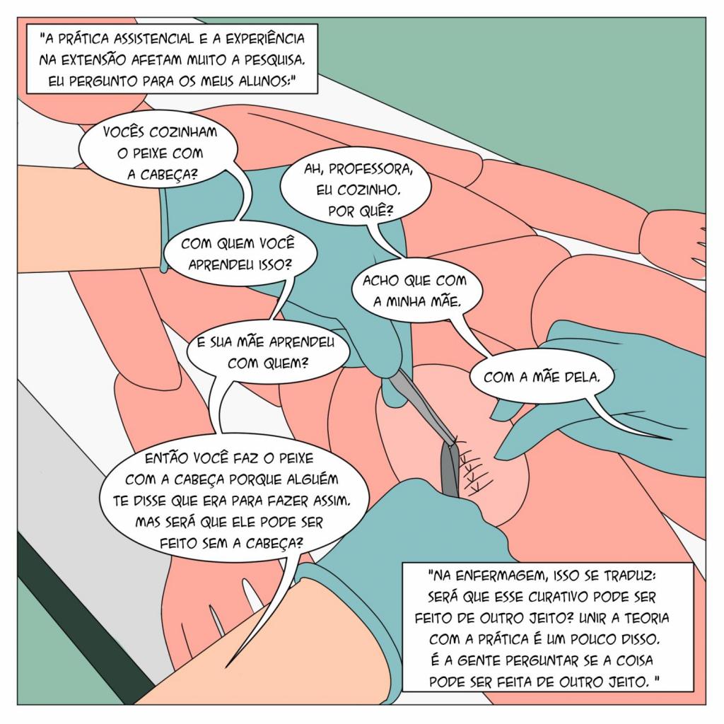 Quadrinho de HQ ilustrada quadrado e colorido. Na ilustração, boneco de material sintético na cor rosa deitado sobre uma maca branca. Na perna direita, mãos com luvas azuis fazer uma sutura. Na parte superior esquerda, o texto "A prática assistencial e a experiência na extensão afetam muito a pesquisa. Eu pergunto para meus alunos". Abaixo, duas sequencias de balões de fala. Na esquerda, as perguntas da professora, na direita, as respostas do aluno. Para a descrição, será reproduzida a partir da sequência. "1. Vocês cozinham o peixe com a cabeça". "2. Ah, professora, eu cozinho. Por quê?". "1. Com quem você aprendeu isso?". "2. Acho que com a minha mãe". "1. E sua mãe aprendeu com quem?". "2. Com a mãe dela." "1. Então você faz o peixe com a cabeça porque alguém te disse que era pra fazer assim. Mas será que ele pode ser feito sem a cabeça?". Na parte inferior direita, o texto: "Na enfermagem, isso se traduz: será que esse curativo pode ser feito de outro jeito? Unir a teoria com a prática é um pouco disso. É a gente perguntar se a coisa pode ser feita de outro jeito".