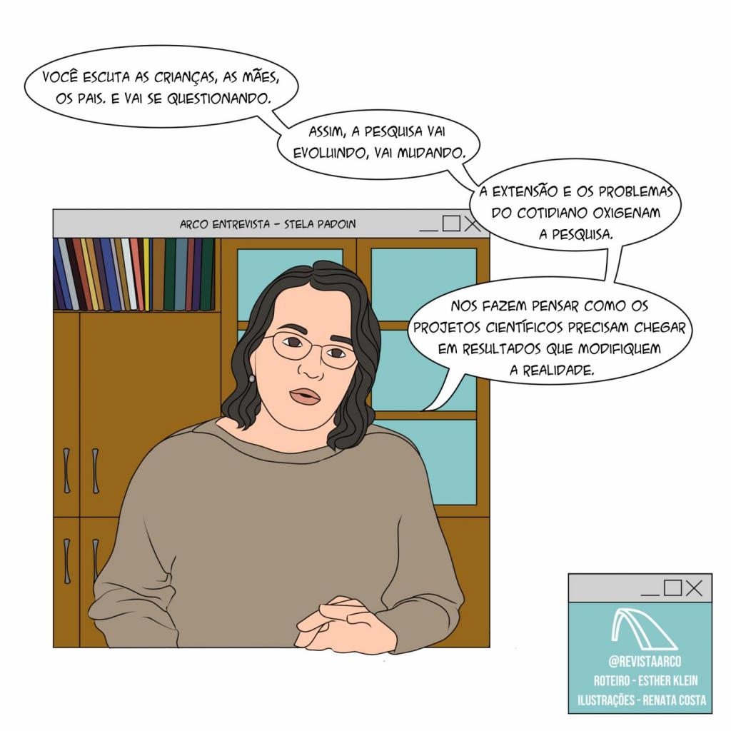 Quadrinho de HQ ilustrada quadrado e colorido. No centro da imagem, aba de meet com o título "Arco Entrevista - Stela Padoin". Abaixo, ilustração de mulher de pele branca, rosto redondo, olhos escuros, cabelos lisos, escuros e na altura do pescoço. Usa óculos de grau e brincos de bolinha. Veste blusa cinza. Ao fundo, janela com moldura marrom, armário e estante com livros. Ao lado, balões de fala que iniciam acima do desenho e contornam ele pelo lado direito. As frase: "Você escuta as crianças, as mães, os pais. E vai se questionando."; "Assim, a pesquisa vai evoluindo, vai mudando"; "A extensão e os problemas do cotidiano oxigenam a pesquisa"; "Nos fazem pensar como os projetos científicos precisam chegar em resultados que modifiquem a realidade". No canto inferior direito, botão com fundo azul claro, e, em branco, a logomarca da Revista Arco e as frases: "Roteiro: Esther Klein"; "Ilustrações: Renata Costa". O fundo é branco.