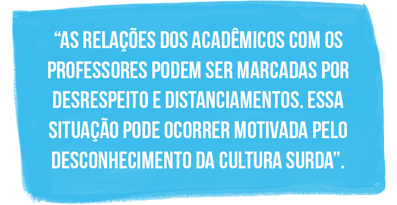 As dificuldades não são propriedade exclusiva dos acadêmicos surdos. Elas acabam se somando a outros contratempos, como, por exemplo, a dependência de um tradutor/intérprete, o que limita, mais ainda, a comunicação com o docente. Além disso, a instituição não possui um intérprete para cada discente, tendo, portanto, que se adequar aos horários deles. São 14 intérpretes ao total. “Acadêmicos surdos e seus professores podem demonstrar insatisfação quanto a uma possível dependência ou invasão do tradutor/intérprete, do ponto de vista da relação de aprendizagem e seus vínculos”, justifica a autora.