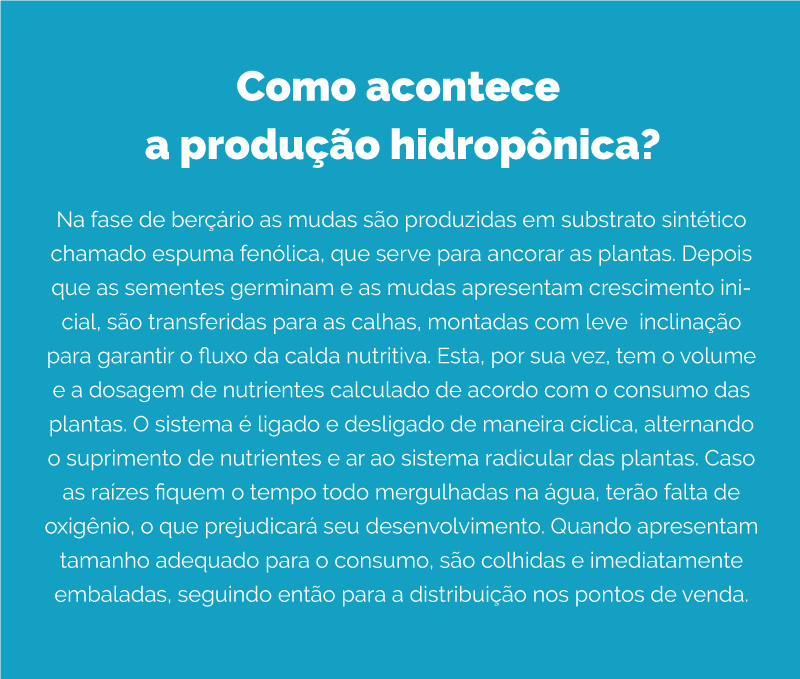 Segundo a professora Natalia, o sistema de hidroponia, por ser conduzido em ambiente protegido (estufas), possibilita o controle de todo o processo produtivo, desde as condições ambientais, como a temperatura e a umidade do ar, até a quantidade de nutrientes recebida pelas hortaliças. Com isso, é possível cultivar plantas em um ciclo mais curto, aumentando a produção por área, além de garantir a qualidade visual do produto, tornando-o mais valorizado no mercado.