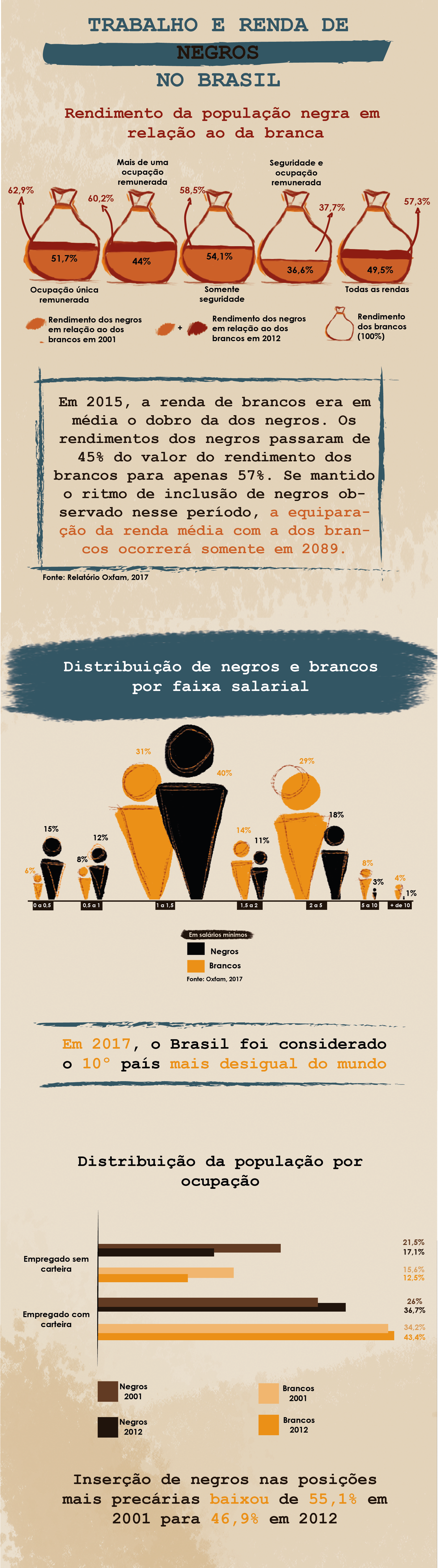 Na segunda matéria do Dossiê Consciência Negra, a revista Arco organizou um infográfico com base em dados apresentados por Maria Rita na tese, comparando a realidade de brancos e negros no mercado de trabalho. Confira: