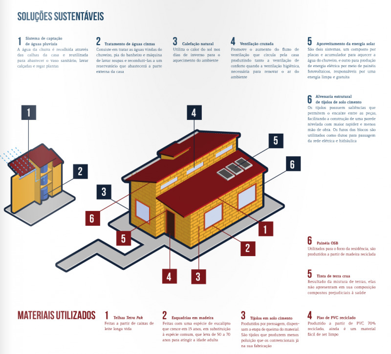 A partir daí, um ano foi destinado à pesquisa de materiais que causassem o menor impacto ao meio ambiente. Então, chegou-se às mais diversas alternativas sustentáveis para compor a casa, desde as telhas tetra pak construídas a partir de caixas de leite, até o piso de PVC reciclado.