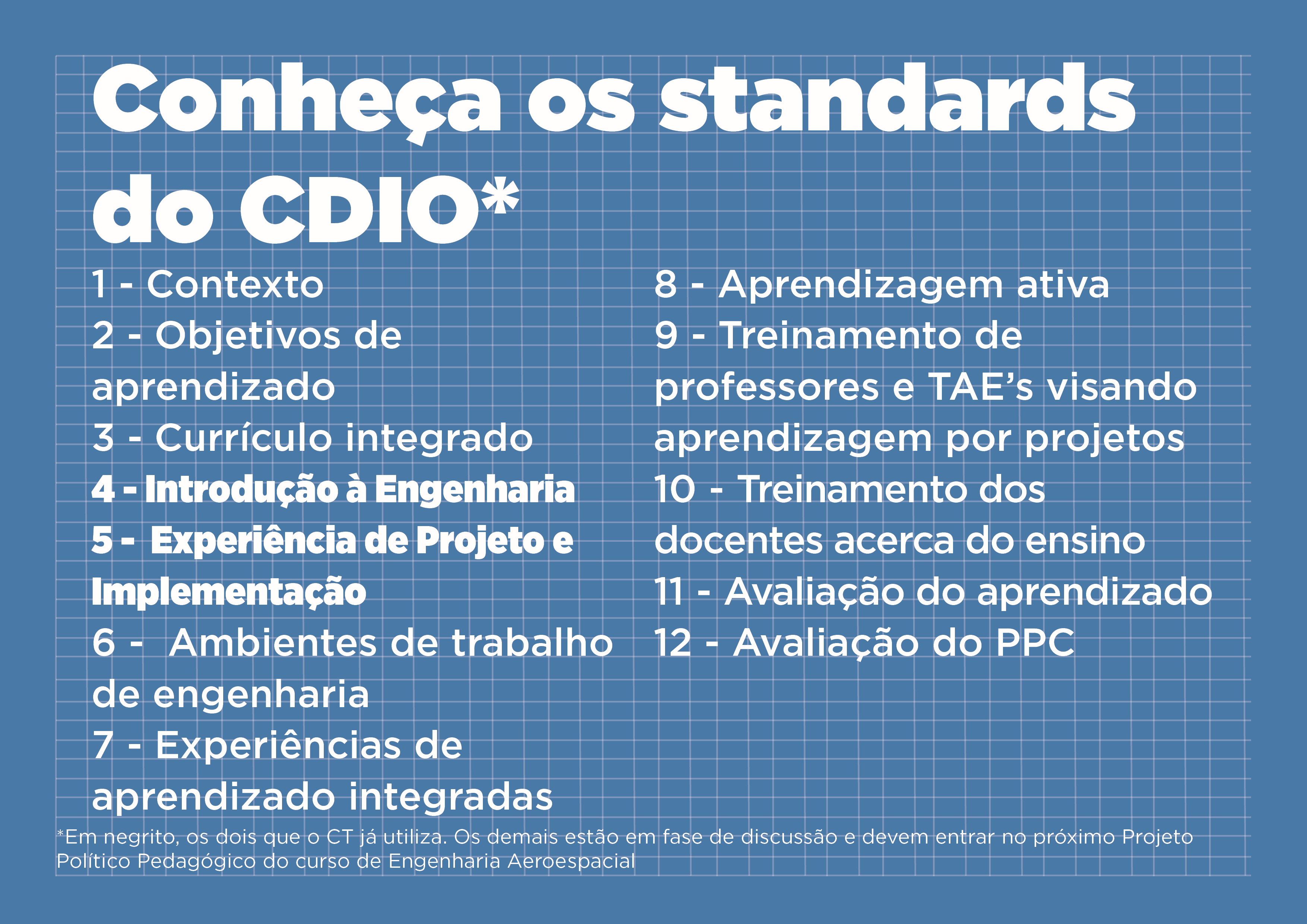 Compartilha de visão semelhante o professor Marcelo Zanetti, do curso de Engenharia de Telecomunicações e colaborador da Engenharia Aeroespacial. Ele aponta que os currículos da área são enormes, com matérias focadas e pouco relacionadas. “É comum que o aluno se interesse mais por certas disciplinas, enquanto que outras são encaradas como meros obstáculos que desmotivam os alunos. Isso resulta em evasão, principalmente no primeiro ano. Assim, é louvável o pioneirismo do curso de Engenharia Aeroespacial na adoção do CDIO”, comenta.