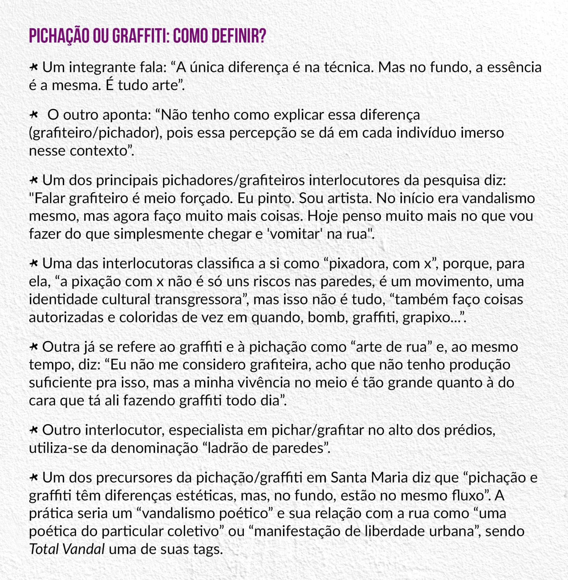 De 2014 a 2017, o então mestrando em Ciências Sociais Rodrigo Nathan Dantas desenvolveu um trabalho etnográfico com 24 pichadores/grafiteiros em Santa Maria. A pichação esteve na vida do pesquisador desde a adolescência – nos primeiros contatos com a música, principalmente o rock, nos desejos e anseios da juventude e na forma como é percebida a cidade. Já no papel de pesquisador, Rodrigo conta que buscou construir um trabalho polifônico, que foge das interpretações romantizadas, e procura apresentar uma perspectiva “mais barulhenta”, na qual “a pichação/graffiti aparece como ponto de encontros discordantes, onde as identidades e as posições são flexíveis e transitórias”.
