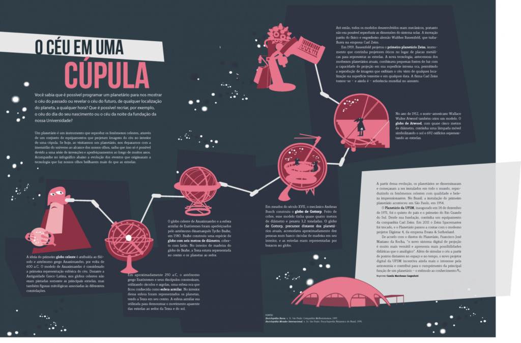 Um planetário é um instrumento que reproduz os fenômenos celestes, através de um conjunto de equipamentos que projetam imagens do céu no interior de uma cúpula. Se hoje, ao visitarmos um planetário, nos deparamos com a imensidão do universo ao alcance dos nossos olhos, saiba que isso só é possível devido a uma série de invenções e aperfeiçoamentos ao longo de muitos anos. Acompanhe no infográfico abaixo a evolução dos eventos que originaram a tecnologia que faz nossos olhos brilharem mais do que as estrelas.