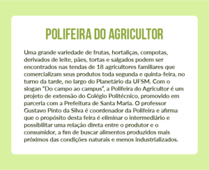 O agricultor Tiago Becker, de 31 anos, que trabalha na Polifeira da UFSM, tira seu sustento da venda de produtos que são cultivados na propriedade, juntamente com o pai e o irmão. A família trabalha com o cultivo de frutas e hortaliças, com criação de animais e, até mesmo, com produção agroindustrial. Becker afirma que produz apenas produtos orgânicos, tanto por ser um nicho diferenciado de mercado quando por sua preocupação com a saúde; ele tem consciência de que o principal prejudicado com o uso de agrotóxicos é o próprio agricultor. Entretanto, comenta que apenas consegue produzir orgânicos porque não existe lavoura de soja por perto da propriedade, já que “a aplicação de veneno nas lavouras de soja prejudica a plantação de orgânicos”.