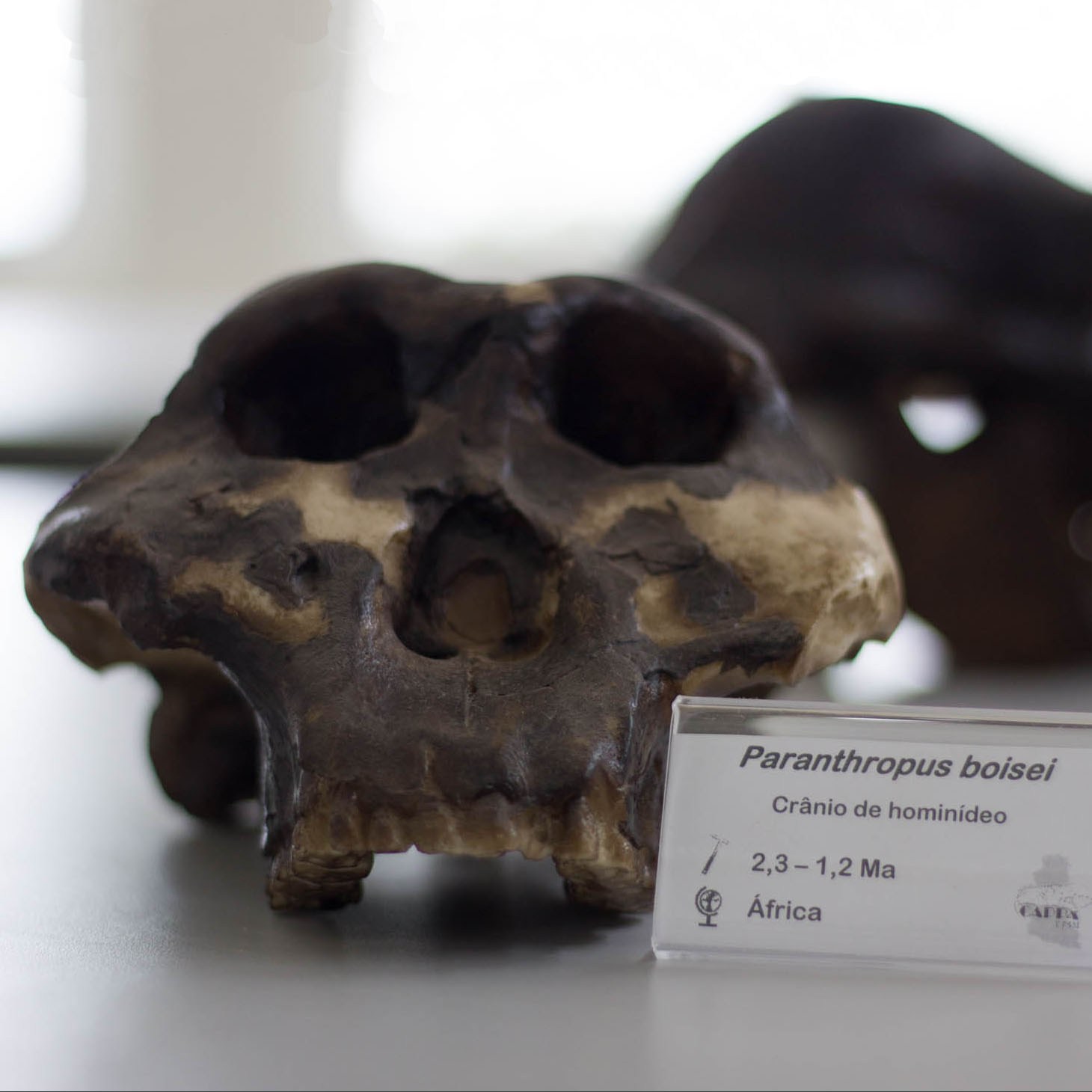 5. O Paranthropus Boisei tem o crânio grande, a mandíbula pesada e grandes e largos molares e pré-molares. O buraco no crânio onde passava o tronco cerebral (chamado forame magno) era curto e lembrava o formato de um coração. Qual é o crânio dele?