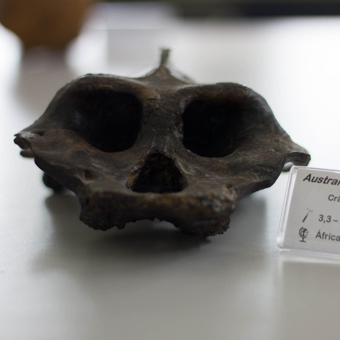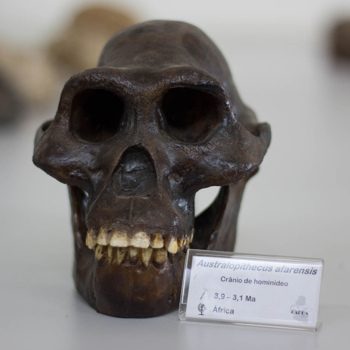 1. O Australopithecus Afarensis viveu entre 3,9 e 3 milhões de anos, na atual Etiópia. Seu cérebro era um pouco maior do que de um chimpanzé moderno e o seu crânio tinha as faces salientes e grandes músculos da mandíbula, o que se observa pelas cristas no crânio. Qual é o crânio dele?