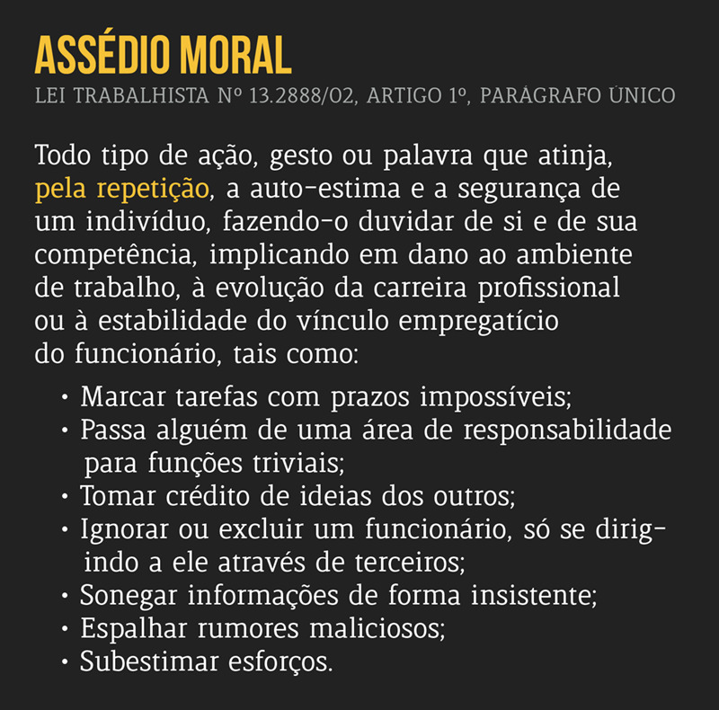 Lara: Completamente. O assédio moral é um fator de adoecimento, e se discute a possibilidade de incluí-lo no código penal. Na nossa pesquisa há inclusive casos de tentativa de suicídio decorrentes do assédio moral.