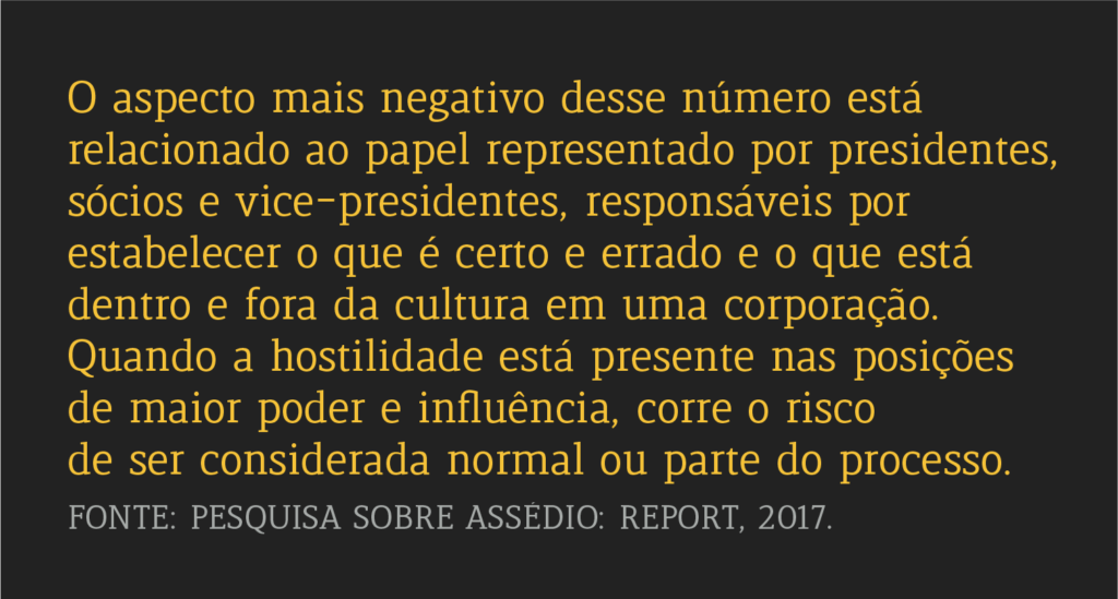 Lara: Alta. Cerca de 1/3 das pessoas que sofreram assédio moral foram assediadas por um presidente ou sócio, incluindo 22% dos assistentes/estagiários. Igualmente, 1/3 das mulheres assediadas sexualmente foram assediadas por um presidente ou sócio. É importante ressaltar que presidentes ou sócios representam uma minoria numérica, então os números são realmente significativos.